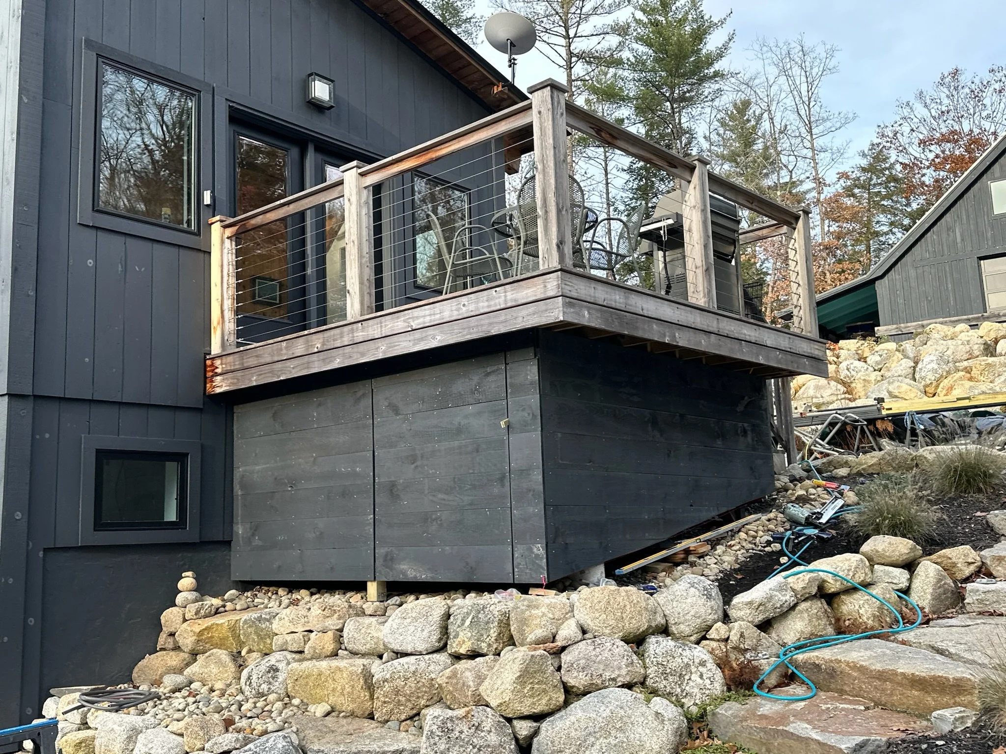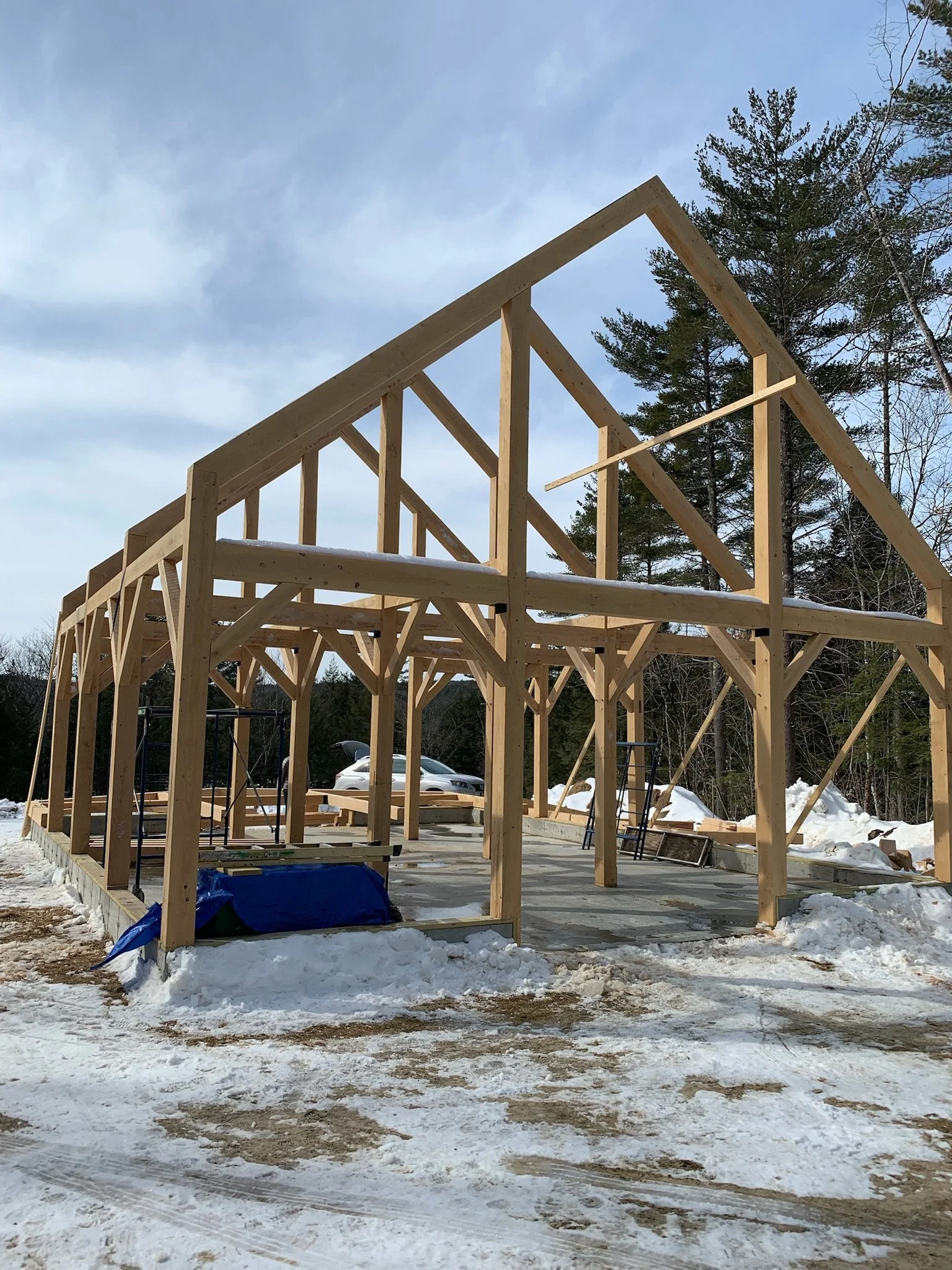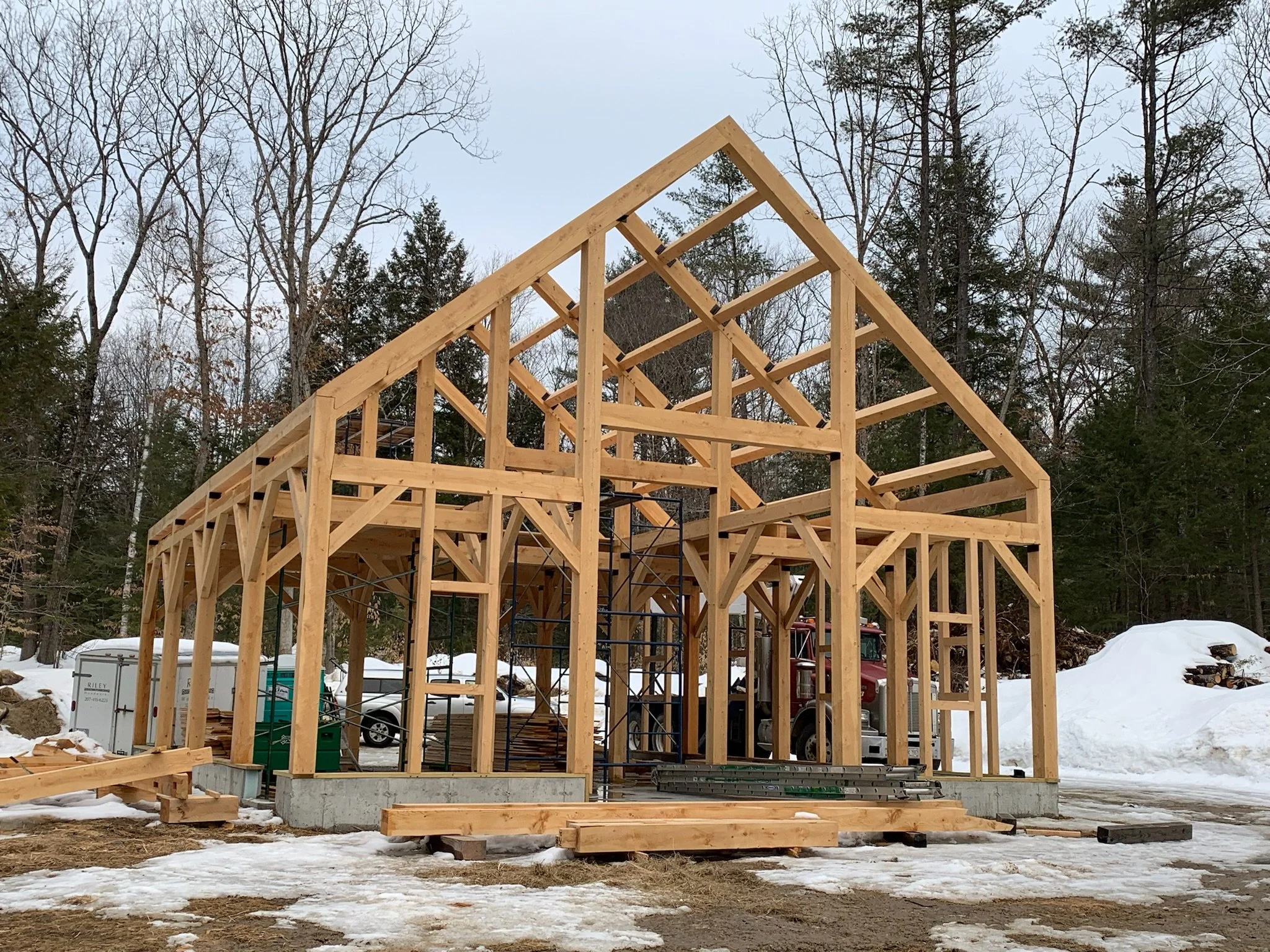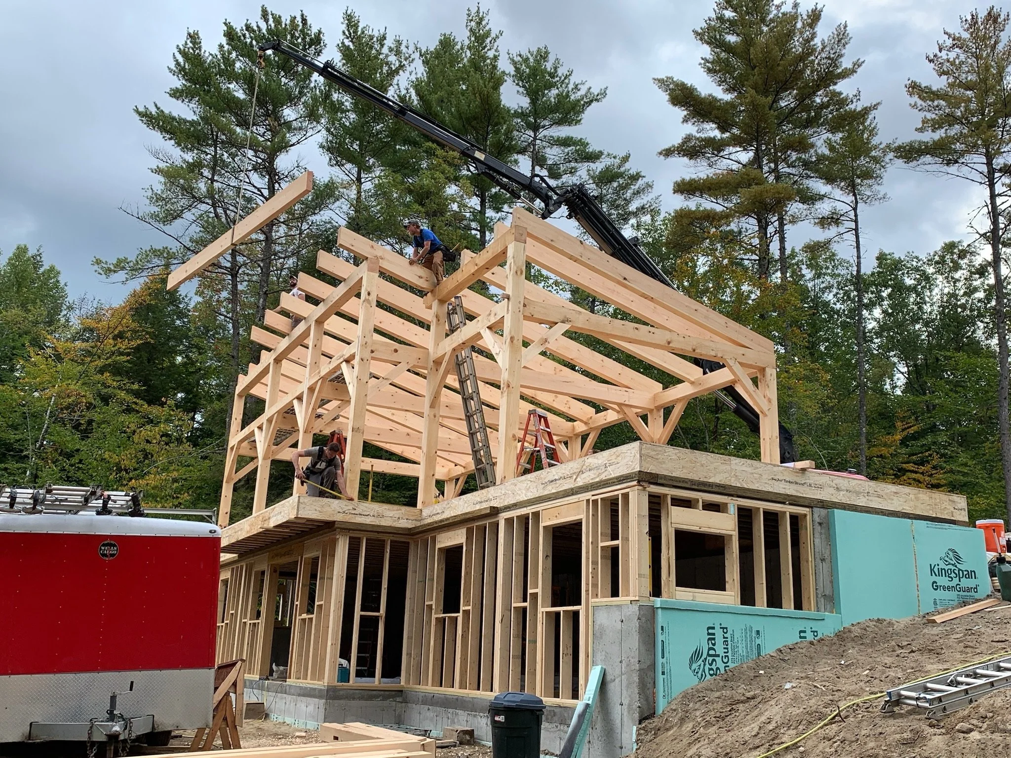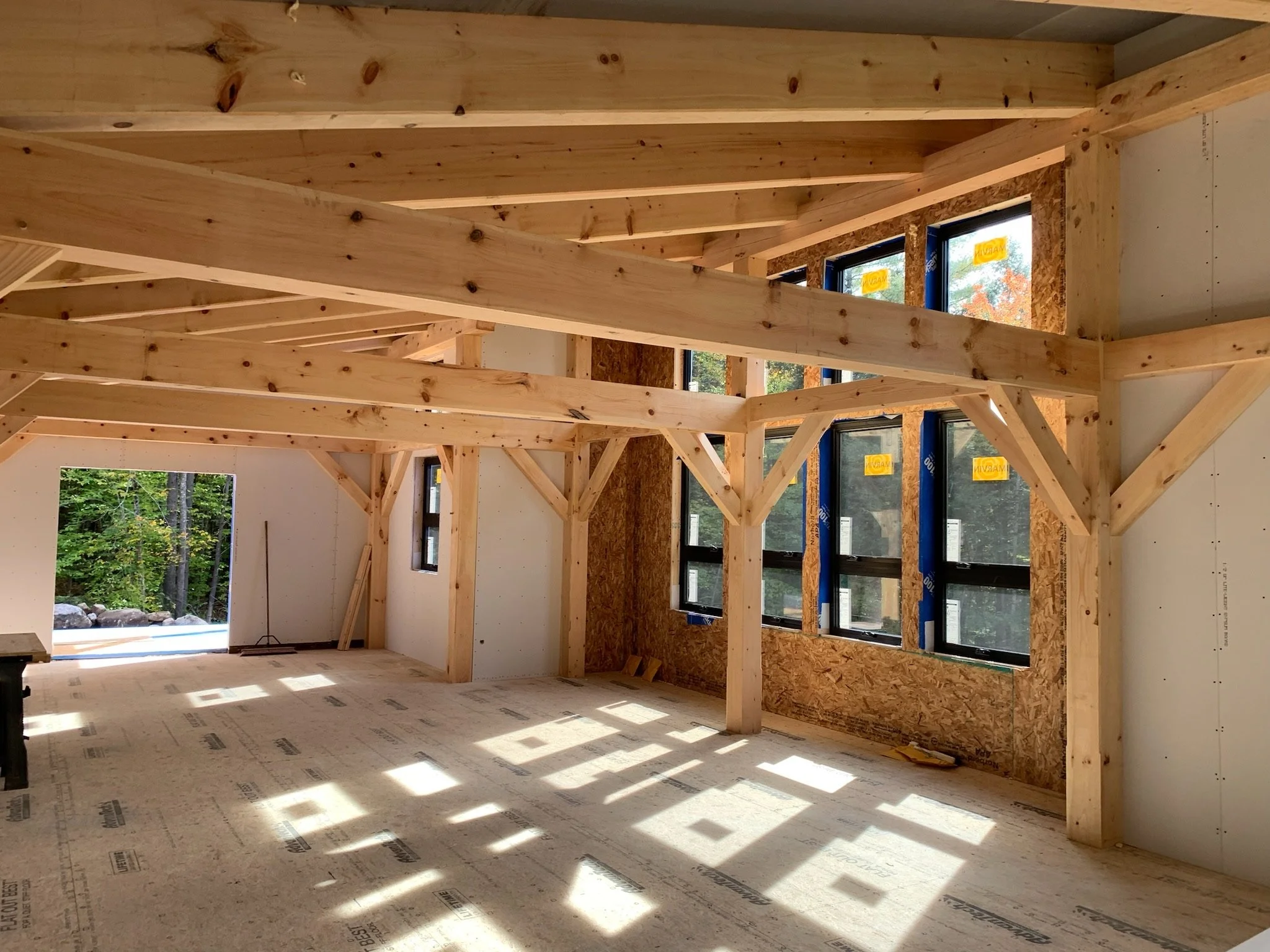 Upper story: Maine pine, locally sourced post and beam construction by Shelter Institute (www.shelterinstitute.com), 6 inch structural insulated panels (SIPs), Henry Blue Skin vapor barrier, rain screen, locally sourced, sustainably harvested ¾ inch rough-sawn pine siding pre-painted before installation. Roof built with 12 inch SIPs.