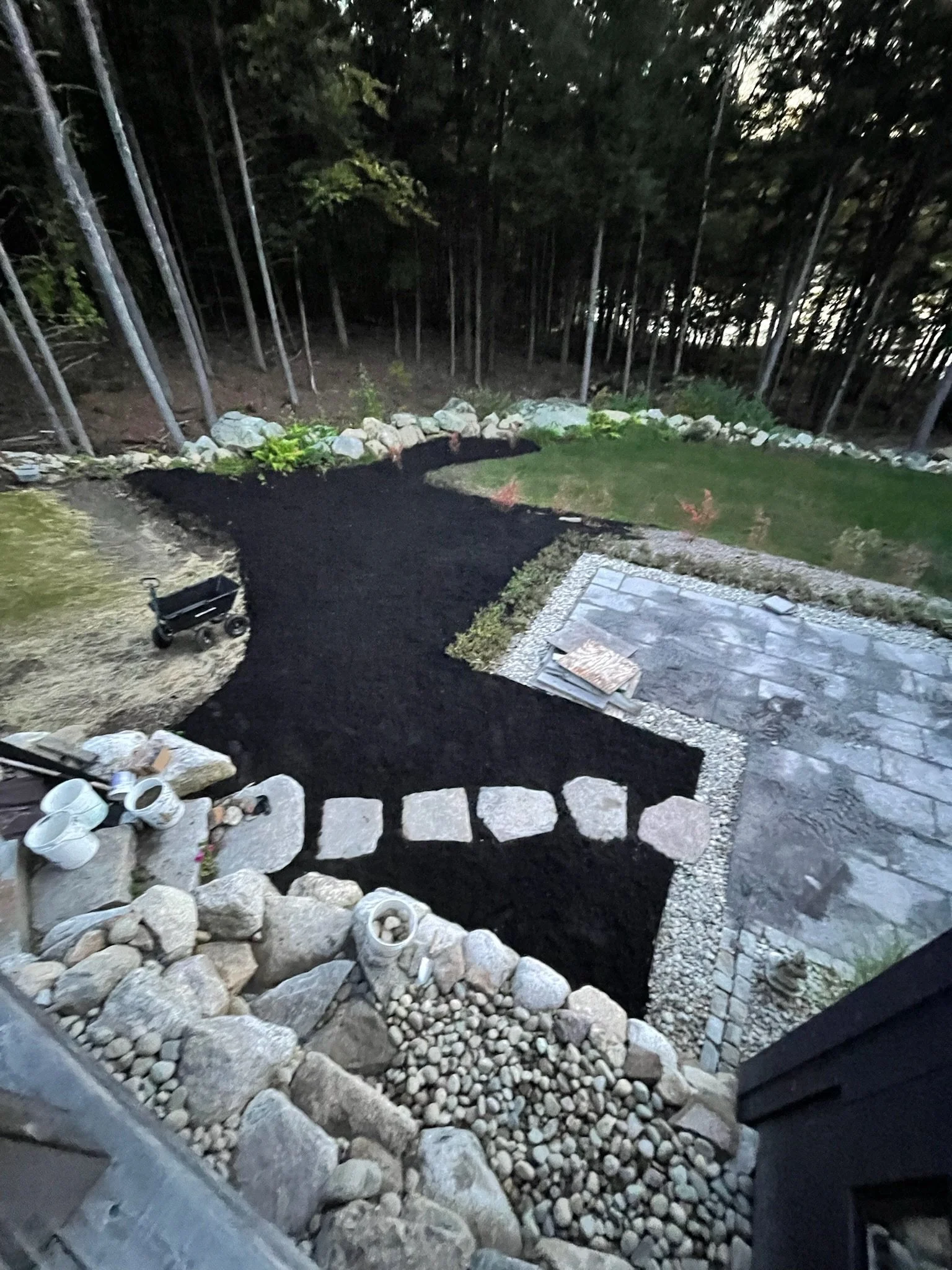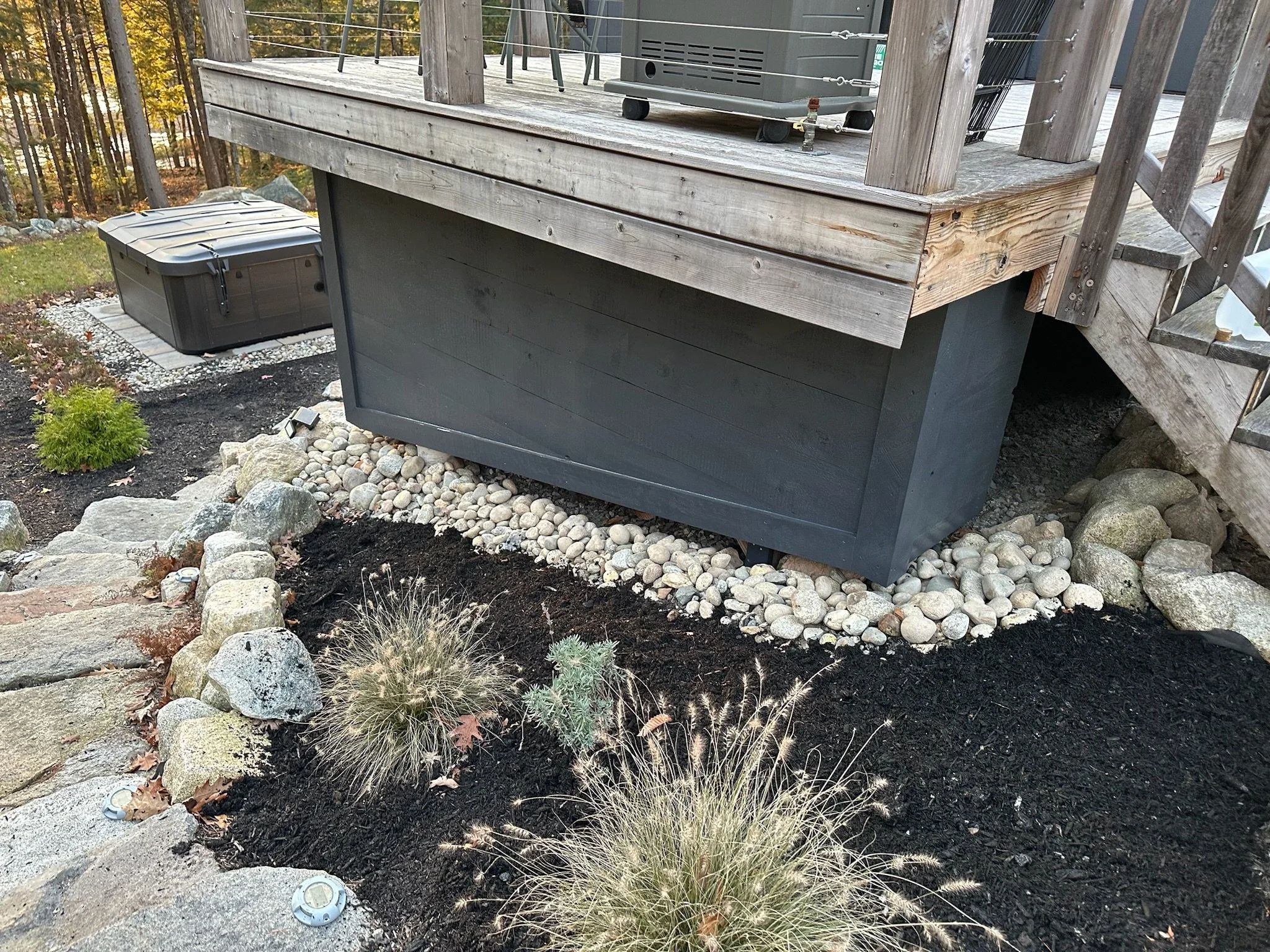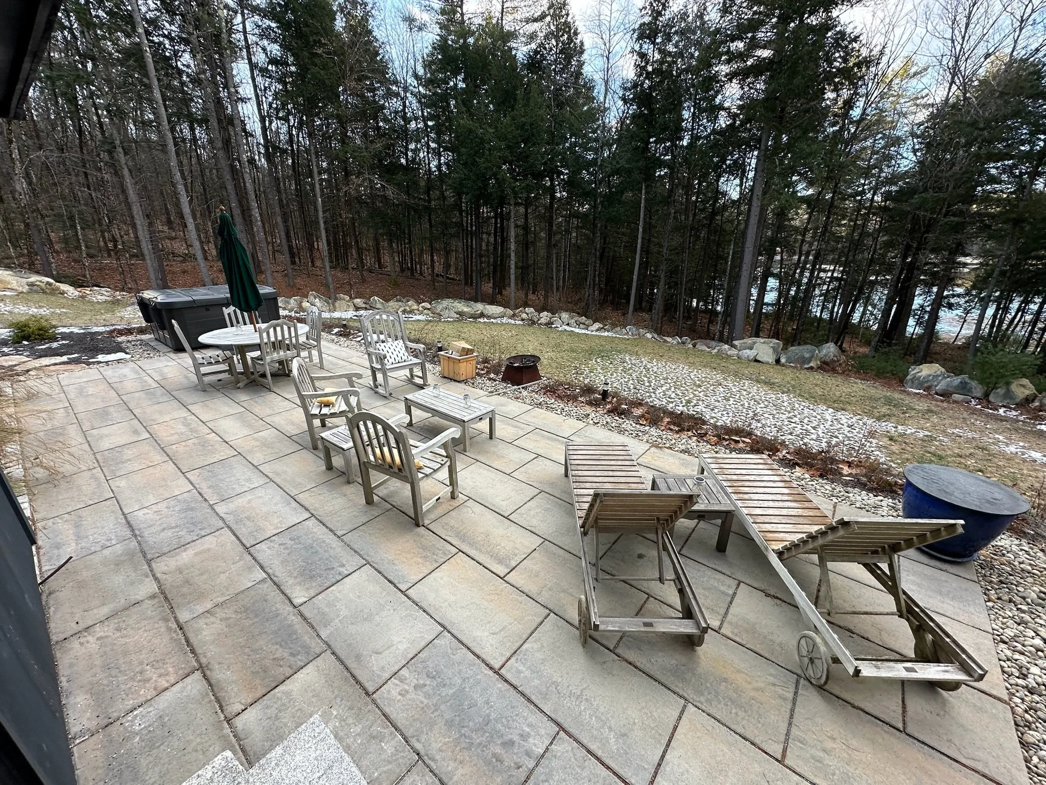 Landscape architect installed patio and grounds including stone steps, drip edge, ornamental grasses, high and low bush blueberries and kitchen garden. New 6-person hot tub, 2023, still under warranty, with rigid cover, lighting, surround sound.
