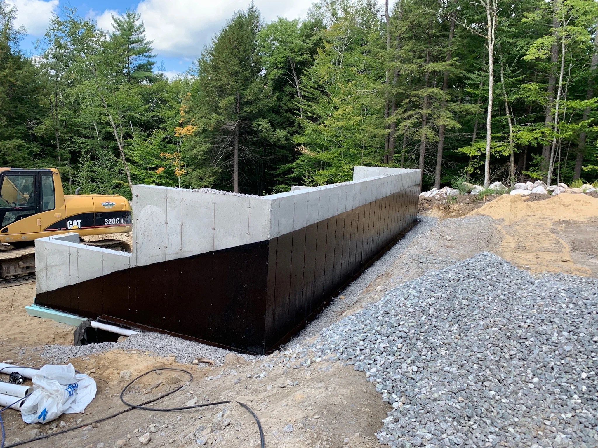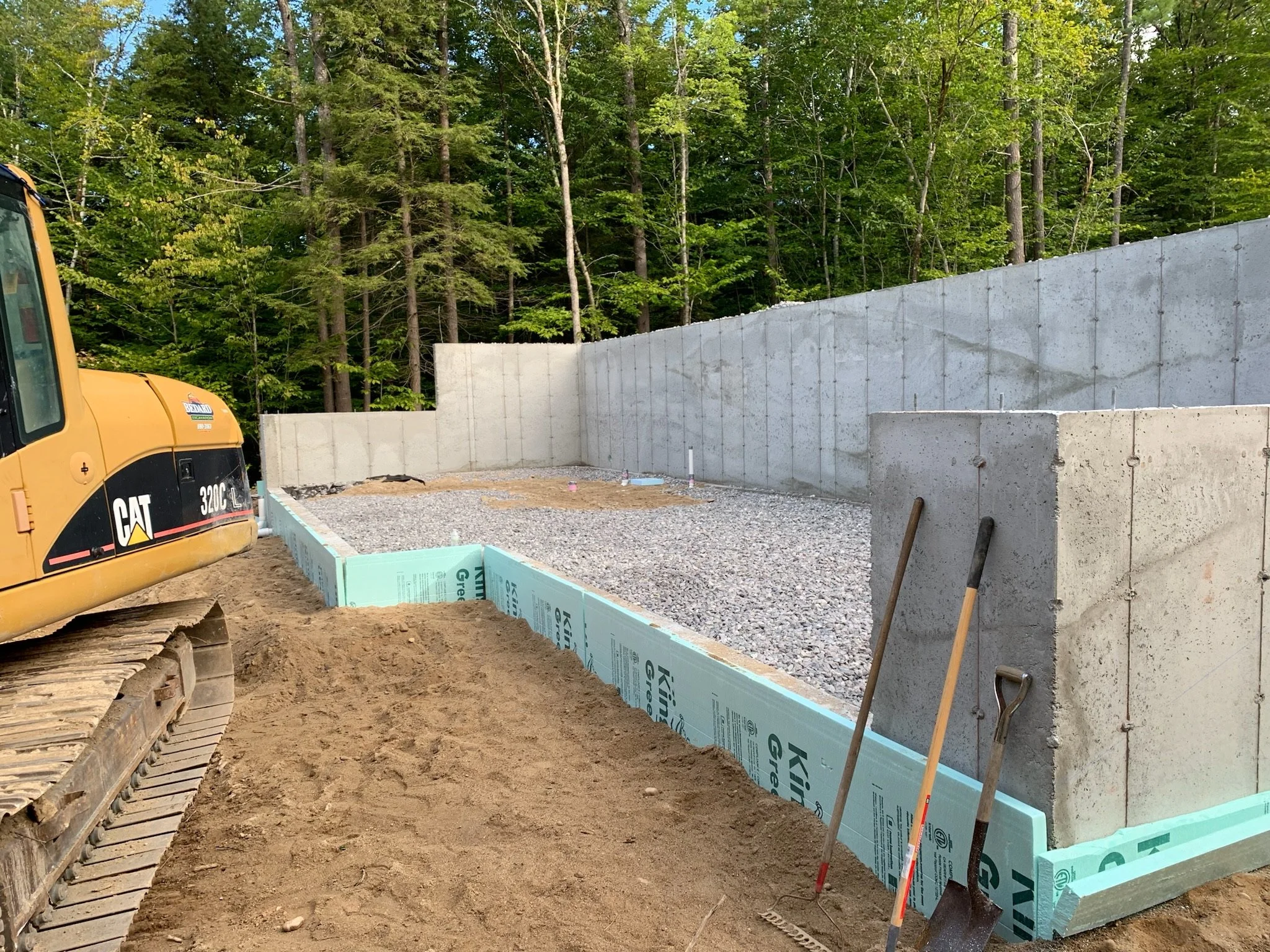 Foundation: extra thick foundation walls, rubberized water-proofing membrane, hydrostatic pressure relief space, 4 inches foam insulation, 2 levels of French drains one at base of footing, second is installed a foot below surface for water remediation